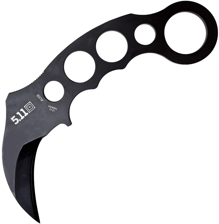 6.5″ overall. 2.5″ black finish AUS-8 stainless blade. Black handle. One-piece construction. Finger ring. Black Kydex neck sheath. Boxed.
