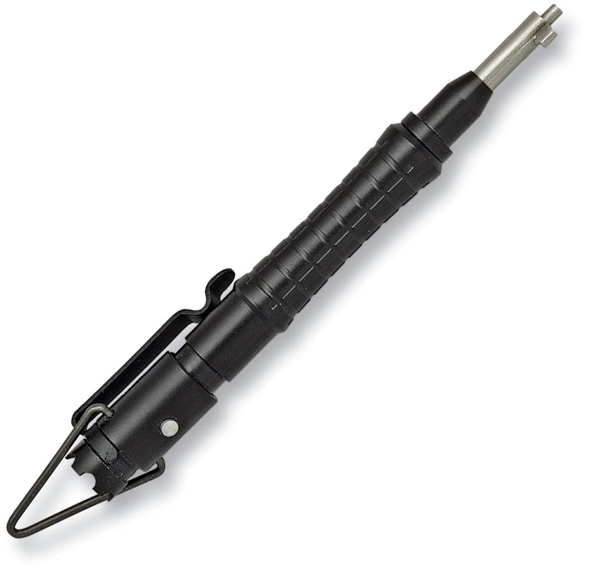 Kubotan. 4″ overall. Pocket clip. Includes handcuff key and LED flashlight. Aluminum construction. Color: Black. Gift boxed.