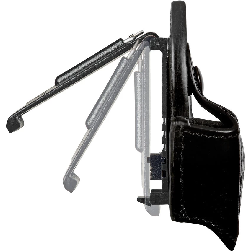 Black basketweave leather. Fits chain or hinged handcuffs. Integral spare key retention pocket. Hang packaged. Cuffs sold separately.
