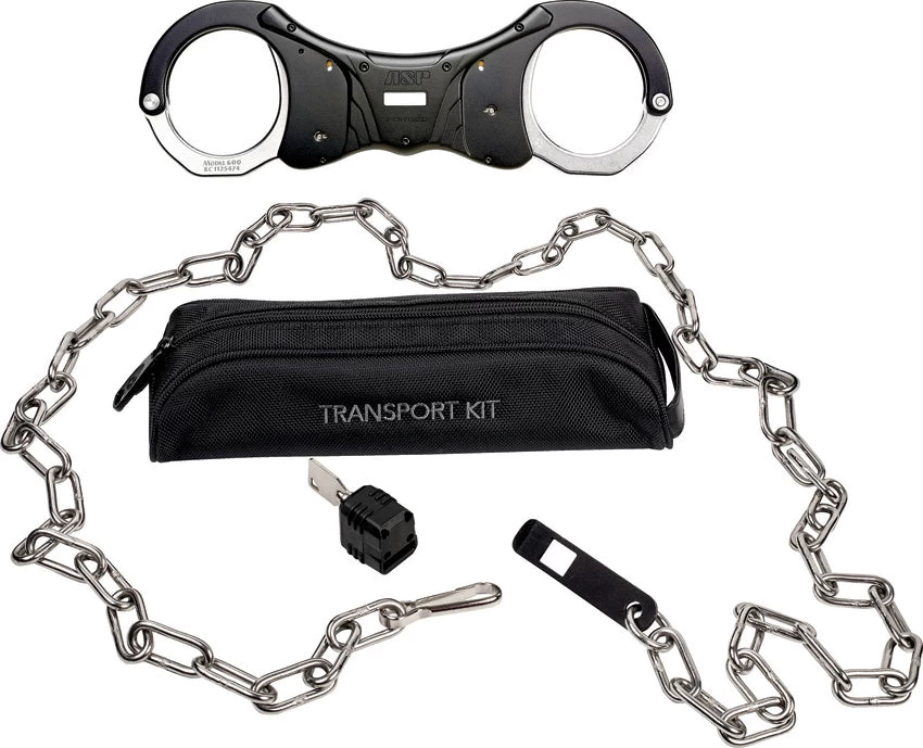 Designed specifically to interface with Rigid Ultra Cuffs (included), converting them to a belly chain system. Belly chain with a special fitting at the end that slides through the slot in the middle of the hand cuffs. Black nylon zippered storage case. Boxed.