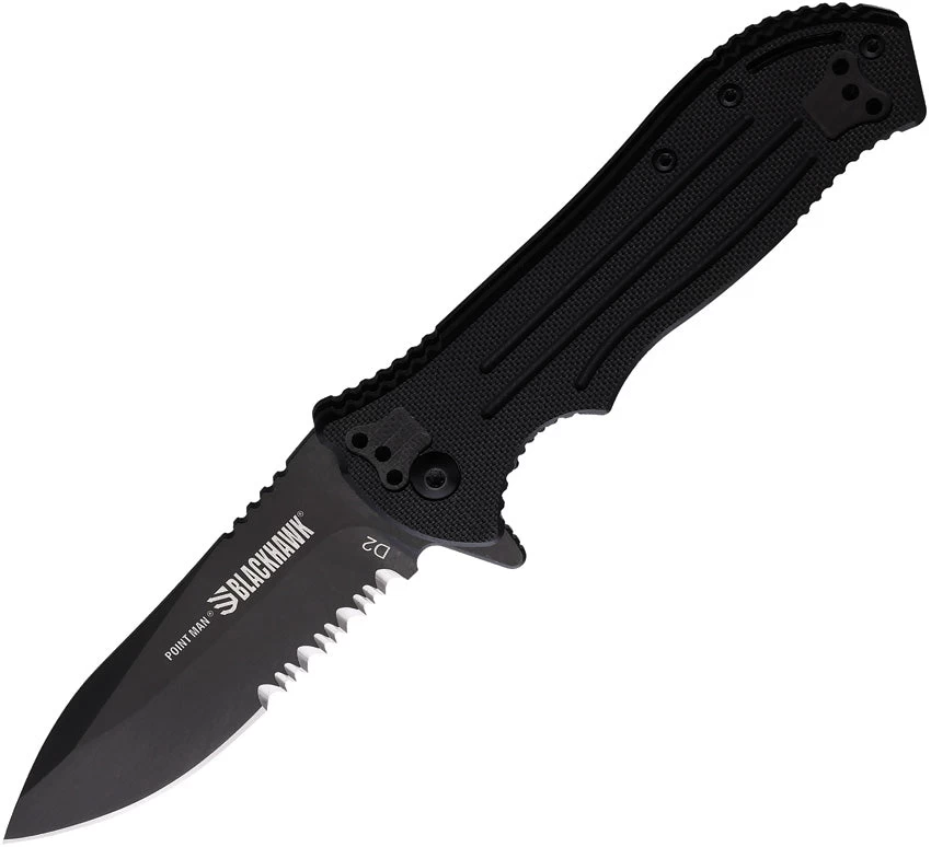 Blackhawk Point Man Linerlock A/O Black G10 Folding D2 Serrated Knife 15PM211BK