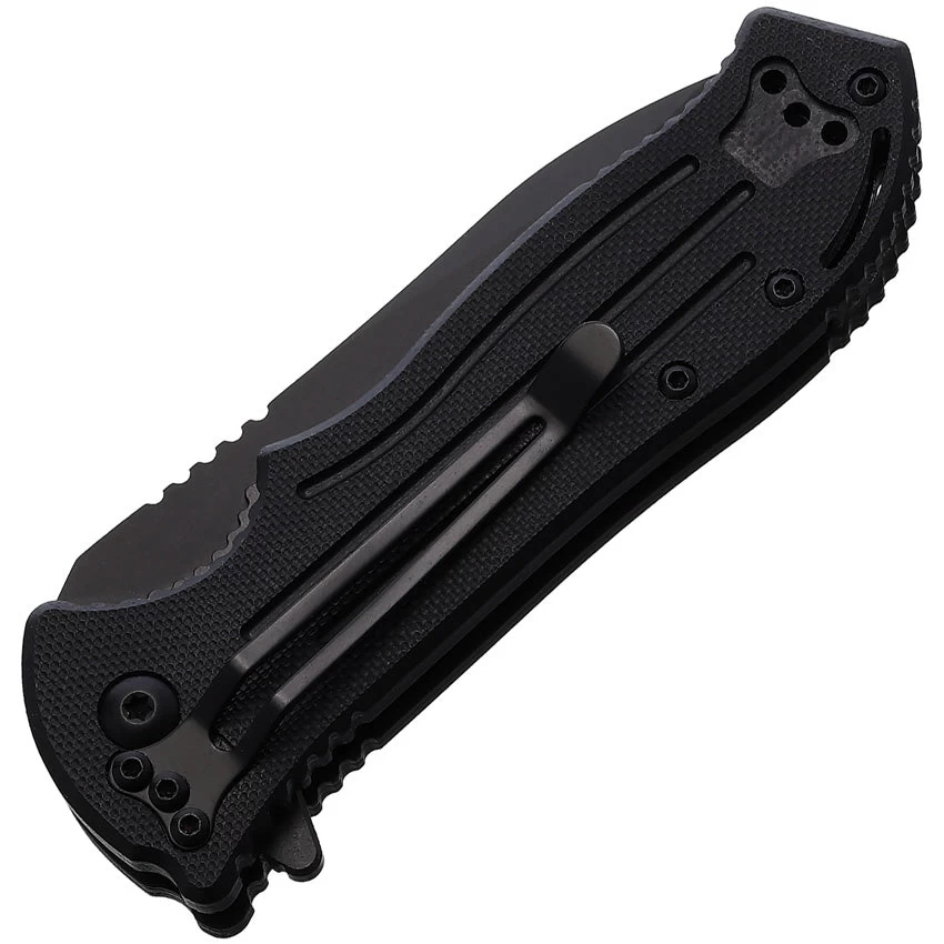 Assisted opening. 4.25″ (10.8cm) closed. 3.25″ (8.26cm) black DLC coated partially serrated D2 tool steel spear point blade. Black G10 handle. Extended tang. Lanyard hole. Pocket clip. Boxed with hanging tab.