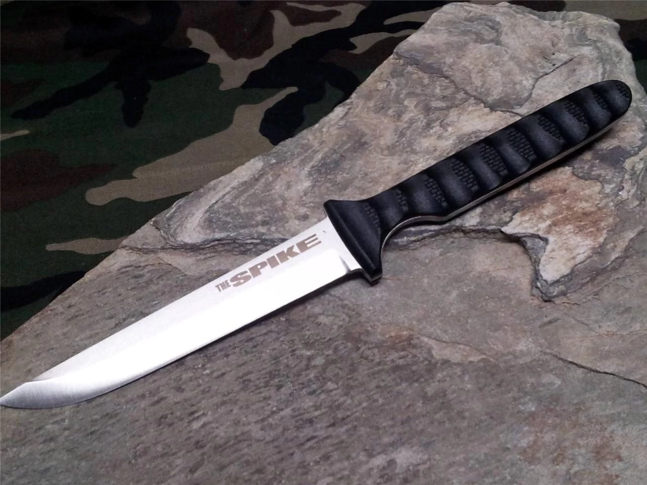Cold Steel Drop Point Spike – 8″ overall. 4″ German 4116 stainless drop point blade with “The Spike” blade etch. Full tang. Black, grooved, G-10 style Griv-Ex handles. Black molded Secure-Ex sheath. Black bead chain. Comes boxed.