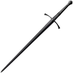 Construction: 1055 Carbon Steel; Overall: 47″; Blade: 35.5″ l Carbon Steel l Standard Edge l Black Finish; Handle: Black l Leather; Other Info: Double edge blade. Black finish steel guard and pommel. Black leather covered woodscabbard with blued finish steel trim. Boxed.