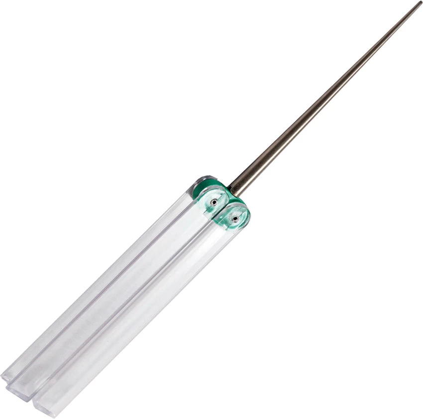 Green, extra fine grit. 4″ diamond cone sharpeners serrated blades quickly and easily. Clear handle folds around sharpening rod for convenient storage. Hang packaged.