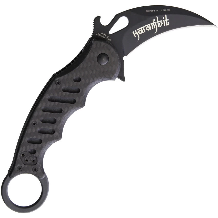 5.25″ closed. 3″ black finish Bohler N690 stainless karambit blade. Finger grooved handle. Finger ring. Pocket clip. Thumb pull. Extended tang. Black G10 and carbon fiber handle.