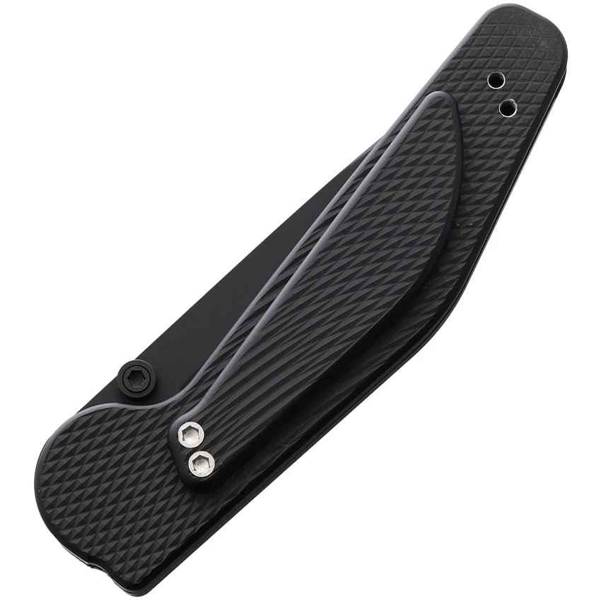 Automatic opening. 4.875” closed. 3.625” Black finish ATS-34 steel partially serrated tanto blade. Hollow Grind. Black anodized 6061-T6 aluminum handle. Button Lock. Hidden Lanyard Hole. Dual sided thumb studs. Tip-Up and Tip-Down right carry pocket clip. Boxed.