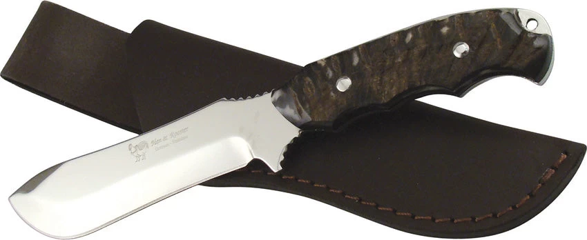 9.5″ overall. 5.25″ mirror finish stainless drop point blade. Ram’s horn handle. Full, extended tang. Lanyard hole. Brown leather belt sheath. Boxed.