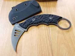 6.25″ overall. 2.38″ gray finish MoVa Stainless hawkbill blade. Black sculpted G10 handle. Full, extended tang. Integrated finger ring. Black Kydex belt sheath. Boxed.