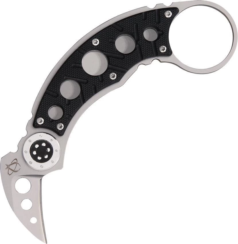 One-piece matte finish AUS-8 stainless construction. 5 1/8″ overall. 1″ blade with machined hole cutouts. Skeletonized handles with black scales. Integrated 1 1/8″ diameter finger ring. Molded black Kydex sheath with black metal clip.
