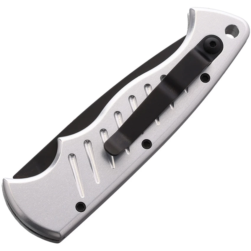Automatic opening. 4.13″ (10.49cm) closed. 3.25″ (8.26cm) black DLC coated 154CM stainless blade. Silver aluminum handle. Lanyard hole. Pocket clip. Boxed.