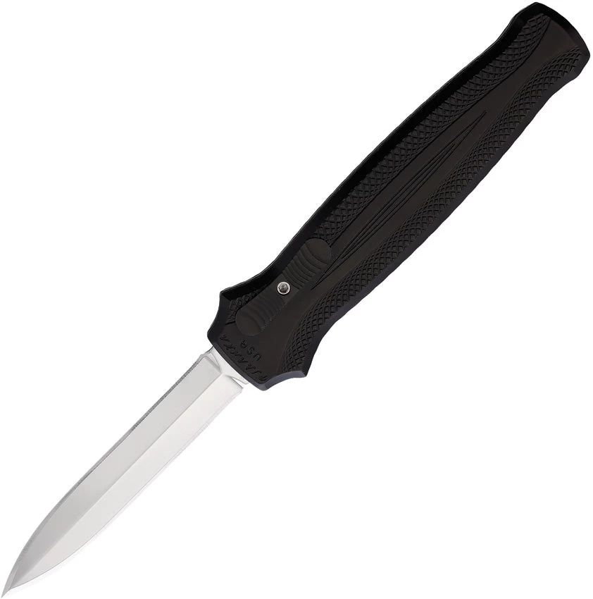 Automatic opening. 4.75″ (12.07cm) closed. 3.5″ (8.89cm) mirror finish double edge 154CM stainless dagger blade. Black aluminum handle. Pocket clip. Boxed.