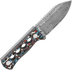 5.25” overall. 2.50” Laminated damascus steel drop point blade. Flat Grind. Nebula black, blue, red, and white carbon fiber handle. Comes with a black kydex sheath and ball chain. Boxed.