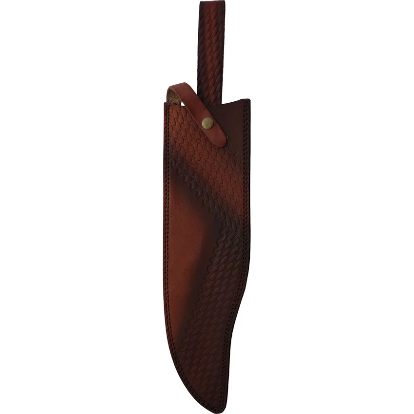 21″ (53.34cm) overall. 14″ (35.56cm) satin finish stainless bowie blade. Brass guard and pommel. Lanyard hole. Full tang. Stag bone and black wood handle. Brown leather belt sheath. Boxed.