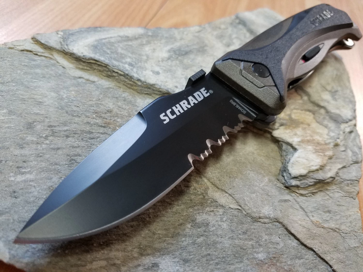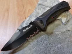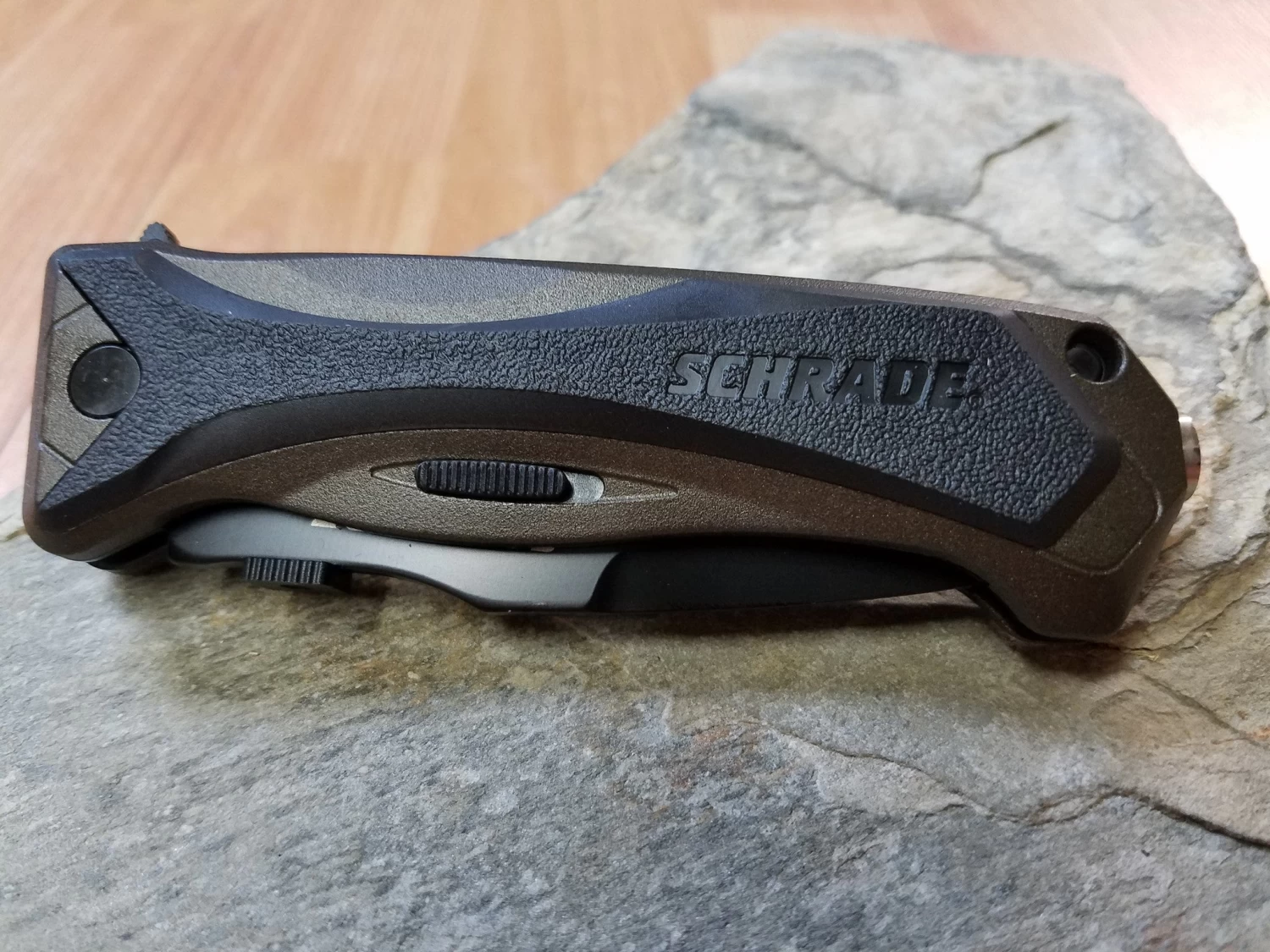 Schrade M.A.G.I.C Assisted Open Folder – 4 7/8″ closed linerlock. 3 5/8″ black finish AUS-8 stainless assisted opening drop point serrated blade with thumb lug and extended tang. Features the M.A.G.I.C. (Multipurpose Assisted Generational Innovative Cutlery) mechanism for quick action. Bronze aluminum handles with black rubberized insert. Integrated glass breaker. Side safety keeps the blade locked closed when not in use. Lanyard hole. Black stainless pocket clip. Comes boxed.