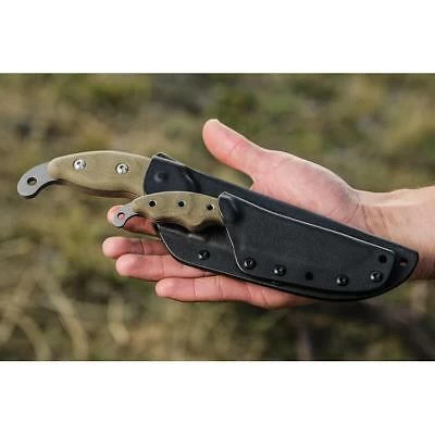 XL – TOPS Knives famous Black River Wash paired with green canvas Micarta handles make these knives as gorgeous as they are useful. You’ll be glad you got them both. The Wind Runner XL Snake River Edition is a re-worked version of a classic TOPS hunting knife. This new version sports our famous Black River Wash with green canvas Micarta handles to provide grip even when they’re wet. This is the larger of the two Wind Runners and it is a great all-around hunting knife. Every detail about the blade was included to make processing animals easy. The subdued tip allows the user to skin without worrying about puncturing a hide. The recurve and sweeping belly are ideal slashing tasks for gutting, skinning, and caping. The high grind on the thick stock make it strong, but with a very sharp edge. The handle is comfortable in standard hunting grips and the green canvas Micarta will help the user keep that grip even when it’s wet (a must when processing game). The Kydex sheath provides excellent retention and a low-profile carry option