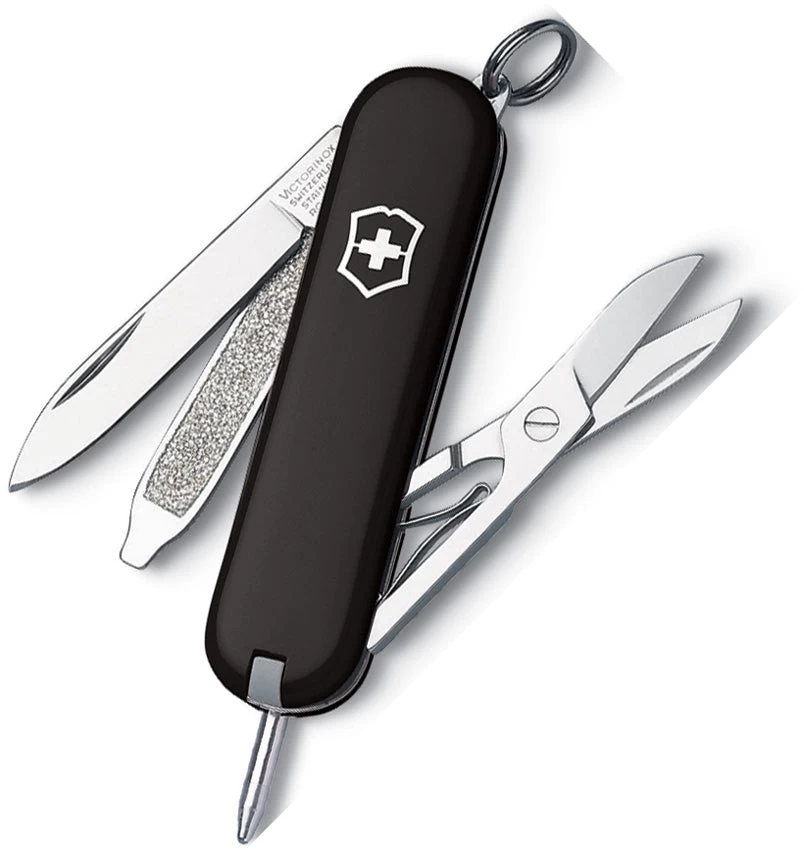 Compact Swiss Army pocketknife for around-the-house use. Enclosed in black housing made to exacting Victorinox standards. Small blade; nail file with screwdriver tip. Retractable pen, scissors, and tweezers. Measures 2.25 inches long; lifetime warranty. From the renowned company that created the Swiss Army knife a century ago comes this set of tools for men and women to tuck into pocket, purse, glove compartment, fishing-tackle box, or anyplace else where it can be found in a hurry. Measuring just 2-14 inches long–smaller than a pack of gum–and sheathed in the famous Swiss Army red plastic, the Signature original pocket knife is a toolbox and manicure kit small enough to fit into a pocket or clip onto a key ring. A valued companion that provides security and confidence, this pocket knife consists of seven separate features and carries a lifetime warranty against defects. The tools folded inside the pocket knife are a small knife blade, scissors, a nail file with a screwdriver tip, and a ballpoint pen.