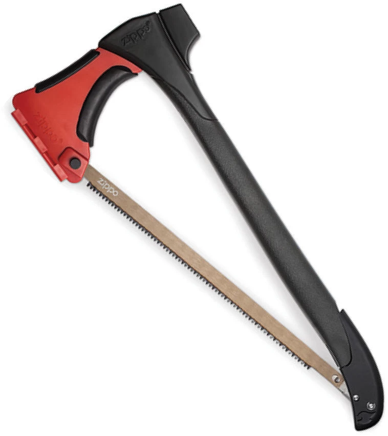 20.5″ overall. 5″ 420 stainless axe head with 3.5″ cutting edge. Black polymer handle. Full tang. 15″ hardened stainless saw blade. Heavy tent stake mallet. Dual function saw handle and safety sheath. Cam and self adjusting tension compensation. Easily cuts and chops branches up to 4″ in diameter. Drives tent stakes easily with full tang head. Bulk packed.
